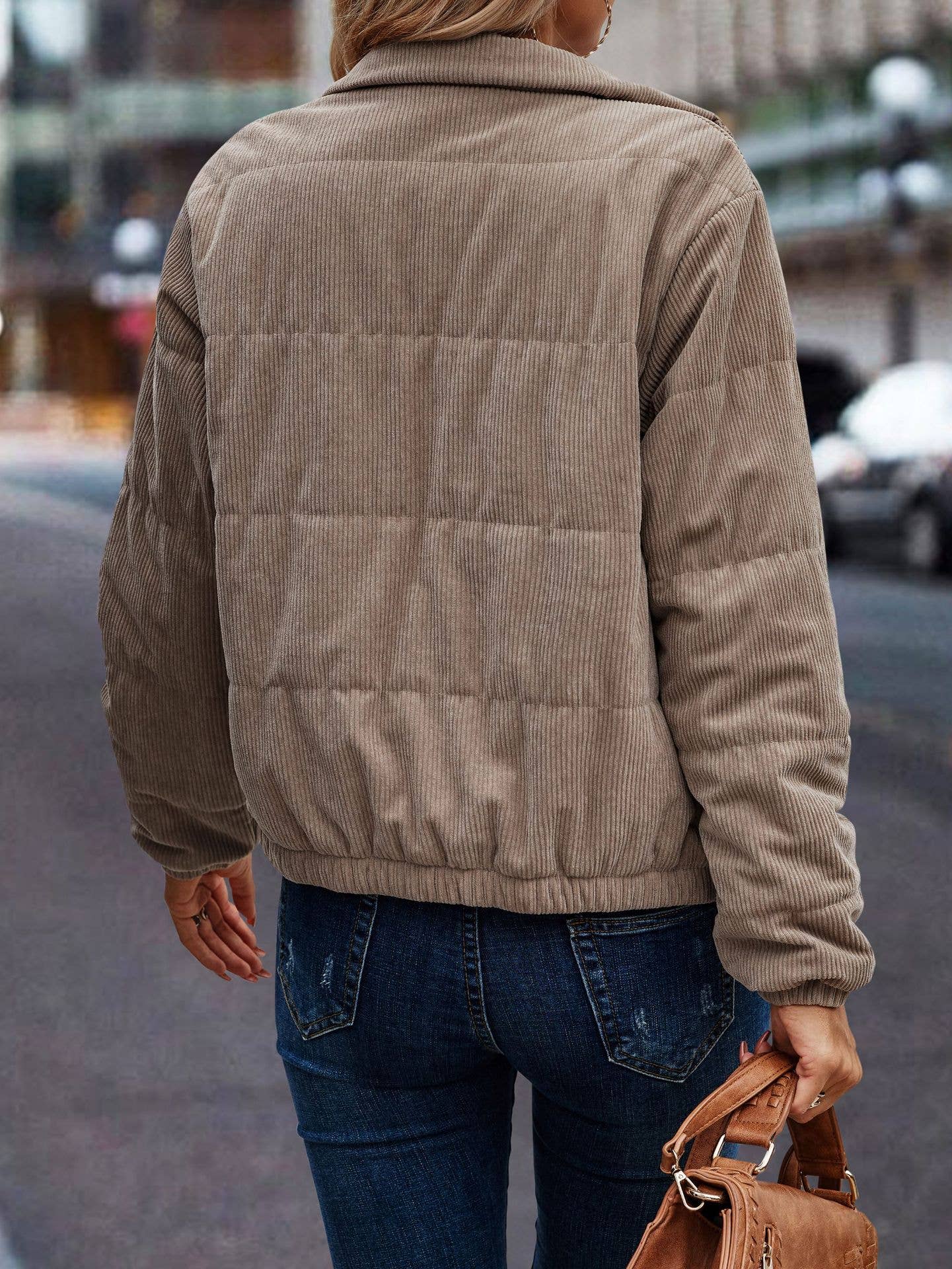 Solid color - Ribbed Corduroy - Long sleeve - Puffer Jacket - Full length - Relaxed Fit Model is wearing a small.