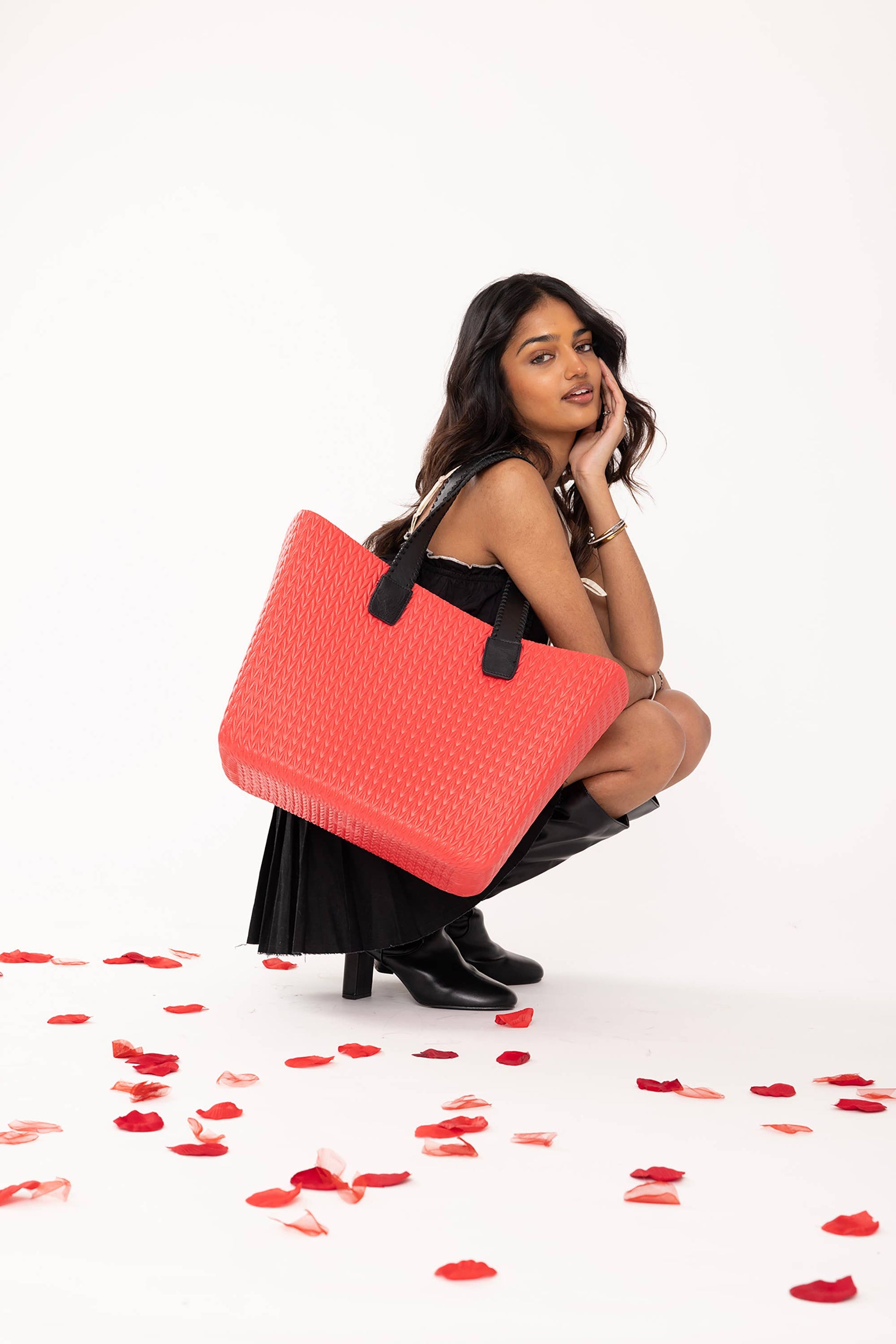 The Carrie Textured Versa Tote in Black is a functional yet stylish accessory, measuring 17.5 inches in length, 11 inches in height, and 7.5 inches in depth. Made from lightweight, durable, and waterproof EVA rubber, it is perfect for everyday use. The removable straps enhance versatility, while the washable interior ensures effortless maintenance.