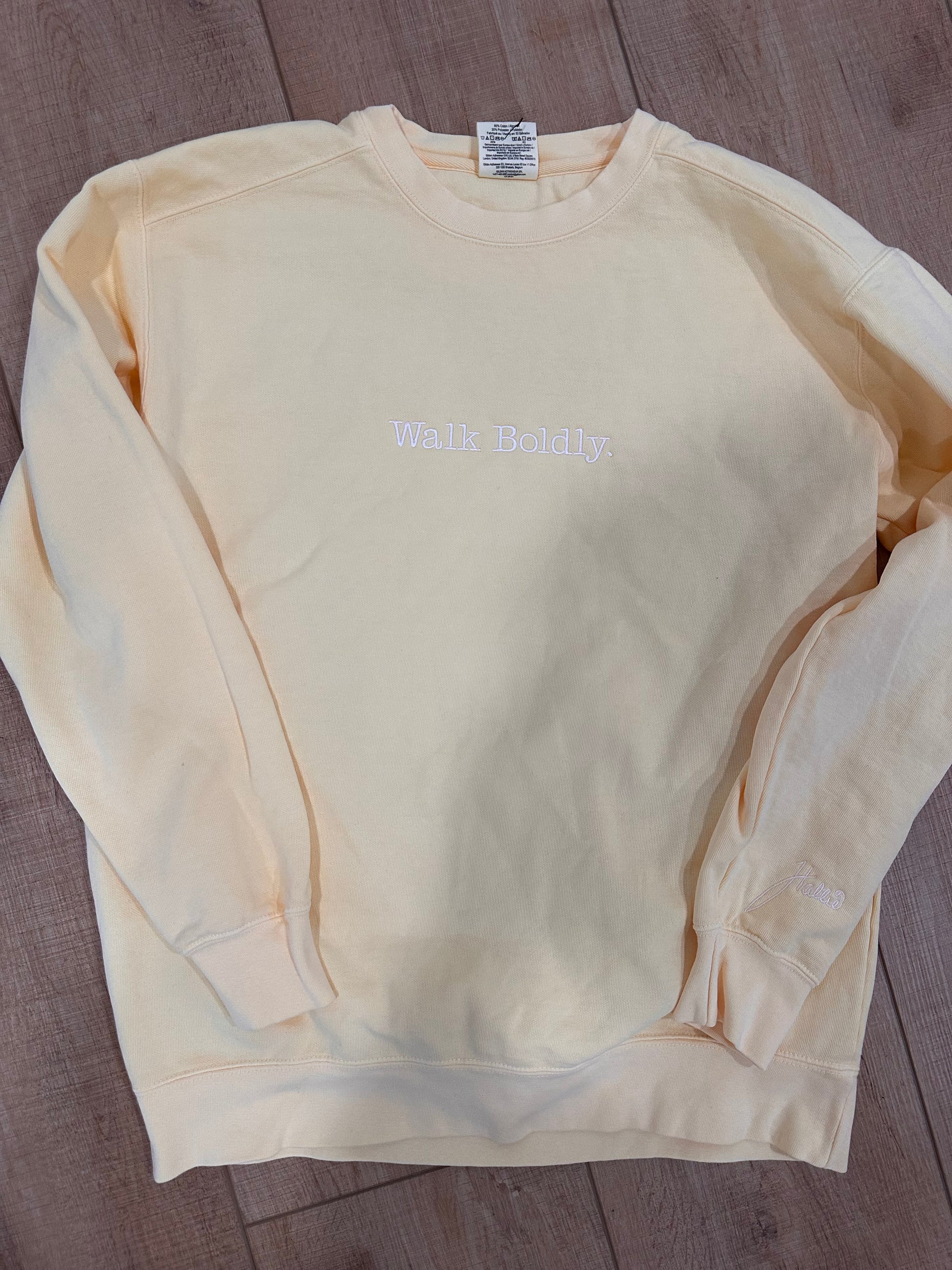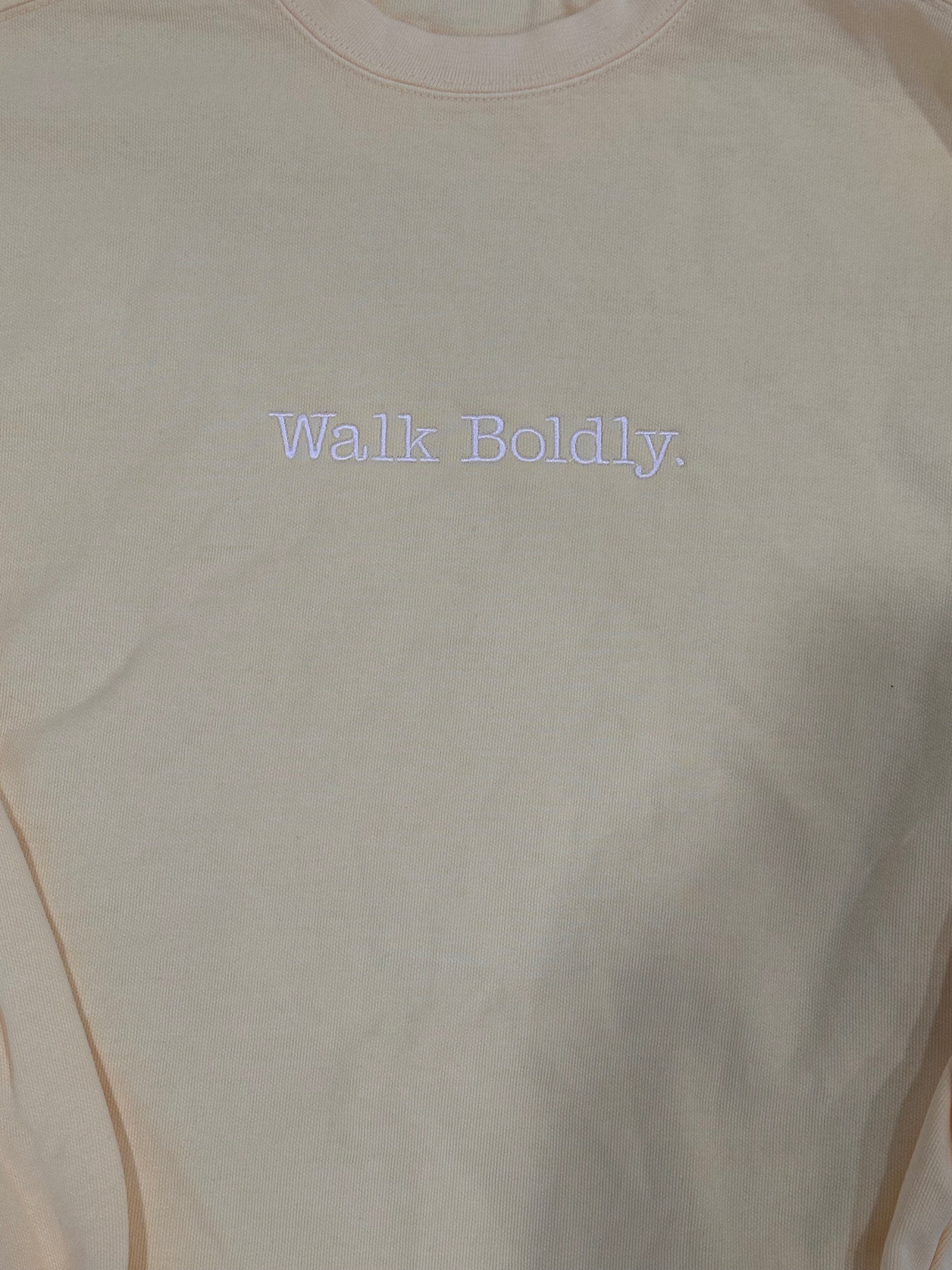 "Walk Boldly" Creme Sweatshirt with Hallie's signature on sleeve.