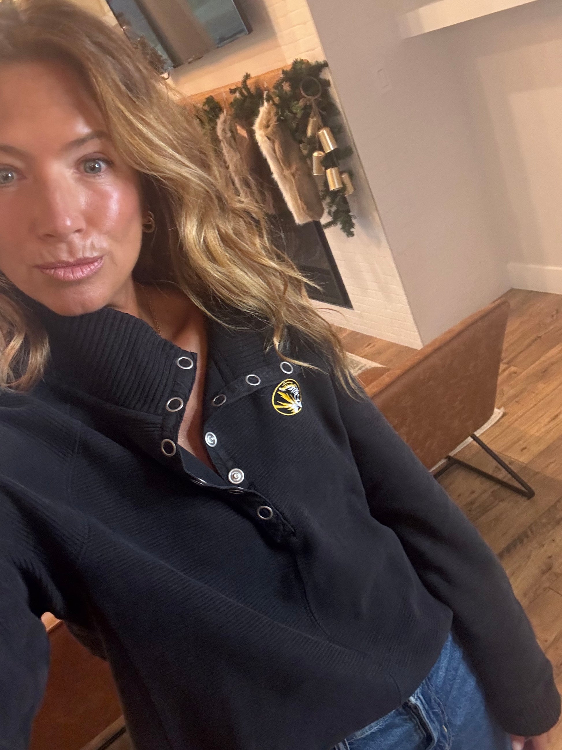 Meet your new favorite throw-on-and-go top for game days, errands, or cozy weekends. This corded black henley delivers the perfect blend of comfort and style, featuring a soft ribbed texture, a relaxed fit, and a snap-button neckline you can wear open or closed. The standout detail is the bold embroidered tiger patch on the chest—adding just the right amount of team spirit without sacrificing everyday wearability.